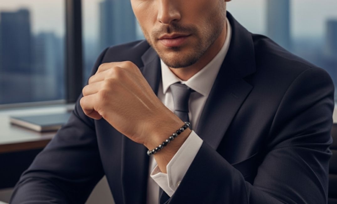 モノトーンやメタリック系の天然石を選べば、スーツにもカジュアルにも自然になじみます。