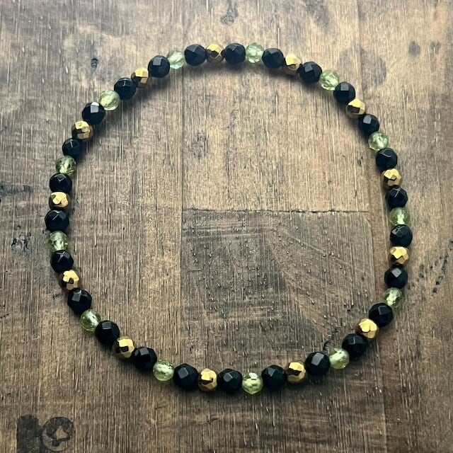 オニキスとペリドットとゴールドカラーヘマタイトを用いたブレスレット。